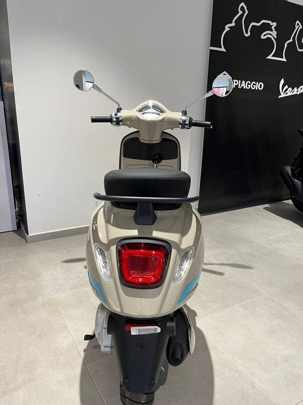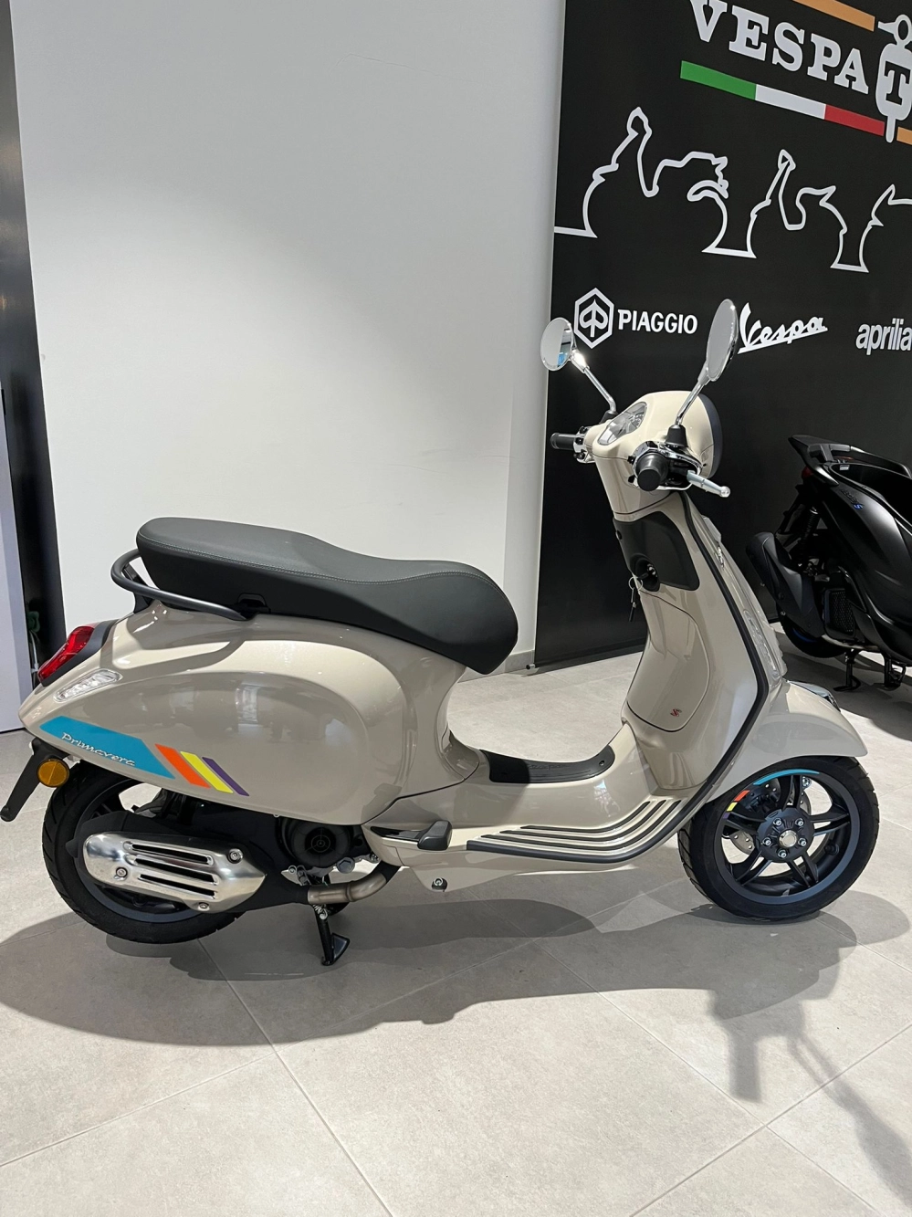 Esta Vespa Primavera 50S en color beige es un modelo elegante y práctico. - Diseño clásico de Vespa. - Ruedas con detalles de color azul. - Adhesivos decorativos en el lateral. Matriculacion no incluida en el precio