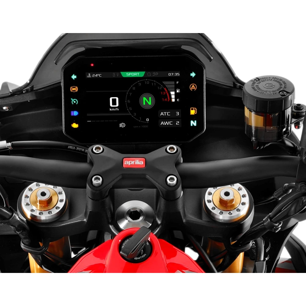 La Aprilia RS 660 Factory lleva la electrónica a un nivel de competición, desbloqueando tu siguiente paso en prestaciones. El paquete APRC (Aprilia Performance Ride Control) integra un completo sistema de controles electrónicos, como el Launch Control, que garantiza unas salidas rapidísimas. Con ABS multimapa en curva para optimizar la frenada cuando la moto está inclinada, y un acelerador electrónico Ride-by-Wire, la RS 660 Factory aporta más tecnología y acción a la carretera. Los mandos retroiluminados del manillar y la pantalla TFT a todo color de 5" con enlace óptico proporcionan una visibilidad perfecta en cualquier condición.