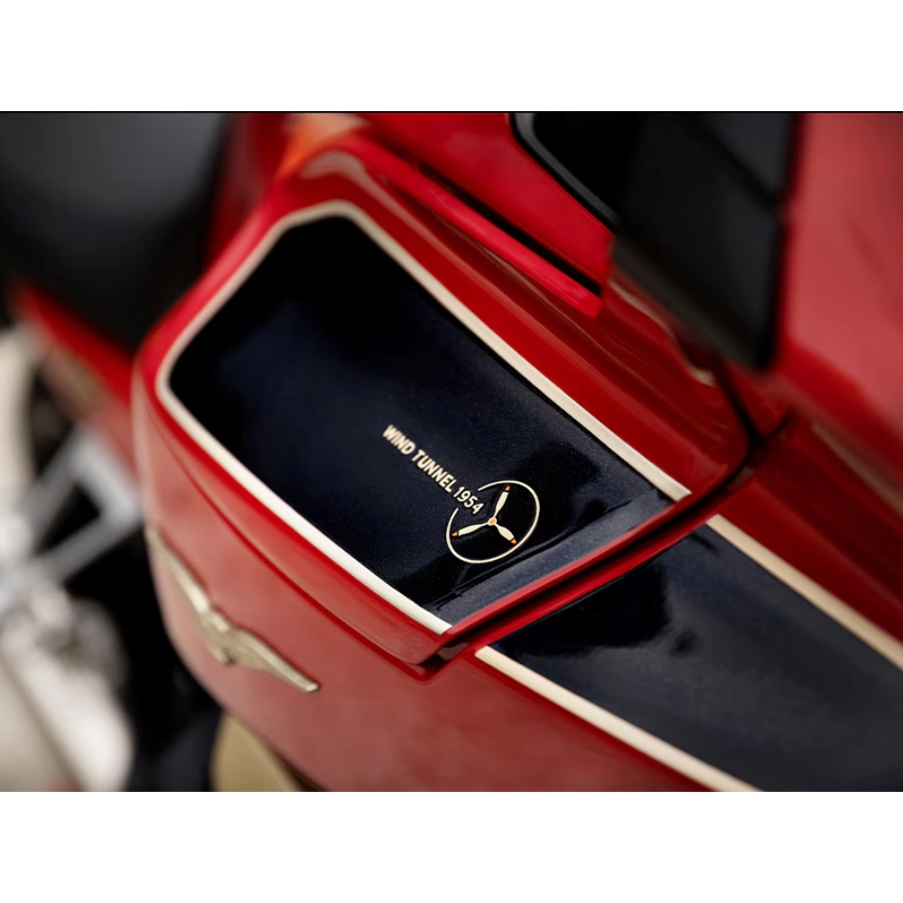 La Moto Guzzi V100 Mandello Wind Tunnel es una combinación perfecta de artesanía italiana, innovación tecnológica y diseño distintivo. Su perfil aerodinámico, modelado en el Túnel del Viento, está resaltado por uno de los colores más icónicos de Moto Guzzi: el rojo que ilumina la decoración, en marcado contraste con el negro del colín y del guardabarros delantero. Los acabados de color champán embellecen el lateral del tanque.