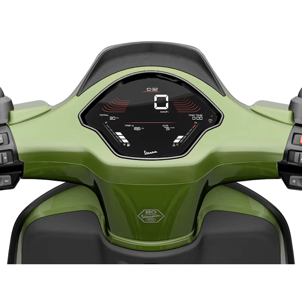 La silueta es inconfundible, pero la Vespa Primavera S revela su modernidad en los detalles. El nuevo salpicadero LCD a todo color de 5" ofrece toda la información esencial de forma clara e inmediata, gracias a sus gráficos modernos y un diseño intuitivo. Con la Vespa MIA (accesorio), la experiencia se amplía aún más: puedes gestionar llamadas y música directamente desde los controles del manillar y acceder a la función de navegación con pictogramas, para una experiencia aún más sencilla y conectada.